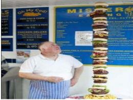 據(jù)英國(guó)《每日郵報(bào)》5月5日?qǐng)?bào)道,英國(guó)一家外賣(mài)店的老板日前成功做出了一個(gè)5英尺4英寸(約1.62米)高的巨型漢堡,據(jù)稱(chēng)其刷新了世界最高漢堡的紀(jì)錄。 日前,英國(guó)蘭開(kāi)夏郡一家名為“吃貨先生的飲食廣??the Mister Eater's Eating ......