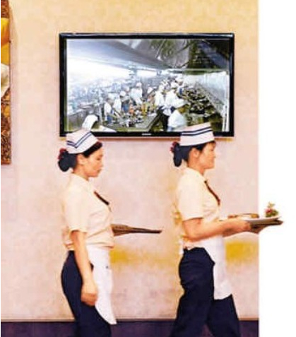 兩名服務(wù)員端著剛剛出鍋的菜肴,走過實時顯示廚房內(nèi)情景的監(jiān)控屏幕
