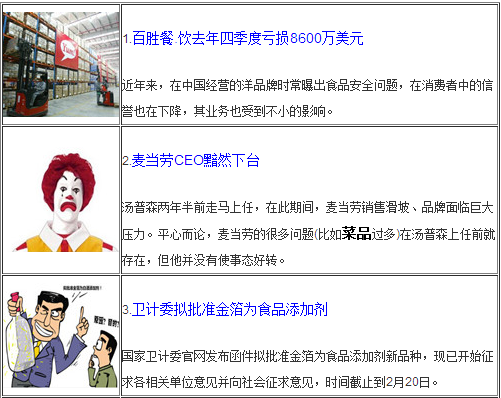 [摘要] 百勝集團(tuán)公布第四季度財(cái)報(bào)虧損巨大,麥當(dāng)勞CEO黯然下臺(tái)。春節(jié)近了,衛(wèi)計(jì)委擬批準(zhǔn)金箔為食品添加劑,因?yàn)闊嶙h。