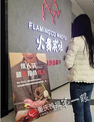 位于南岸區(qū)時(shí)代星光廣場(chǎng)的火舞炭燒主營炭燒、烤肉,他們打出的廣告詞是———情人節(jié),就不接待情人(如圖)!拔乙呀(jīng)給服務(wù)員打好招呼,遇到手挽手成雙成對(duì)的恕不接待!崩习宀虖┬瘢槿斯(jié)不能只有耍朋友的開心了,單身的人悲傷度過。他準(zhǔn)備唱反調(diào)到底,他還會(huì)給屆時(shí)前來就餐單身人士準(zhǔn)備一份禮物。