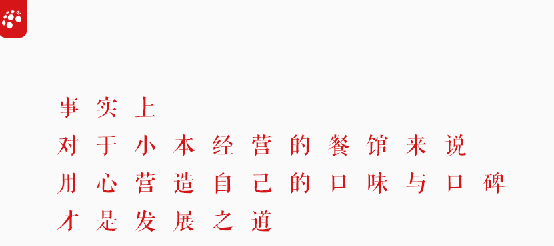 好口碑的形成一向離不開(kāi)自己家菜品的口味保證,小餐館拼不了高級(jí)營(yíng)銷,如果連菜品口味都不追求的話,那基本就無(wú)望了。