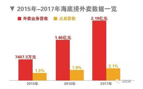 公開資料顯示,早在2010年6月,海底撈“Hi撈送”成立,成為首家推出外賣業(yè)務的火鍋餐廳,至今在國內(nèi)40余個城市推出外賣業(yè)務,2017年海底撈外賣業(yè)務收入為2億元。